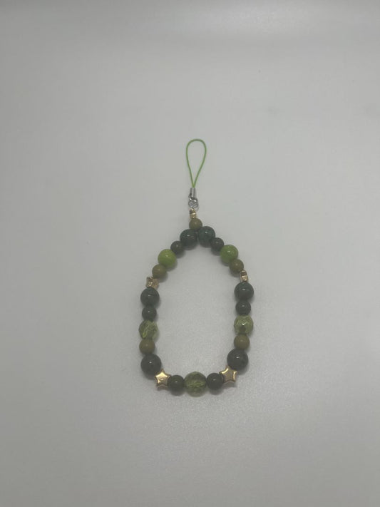 Green Multi-Toned Beaded Phone Charm with Gold Stars | Light Green Strap