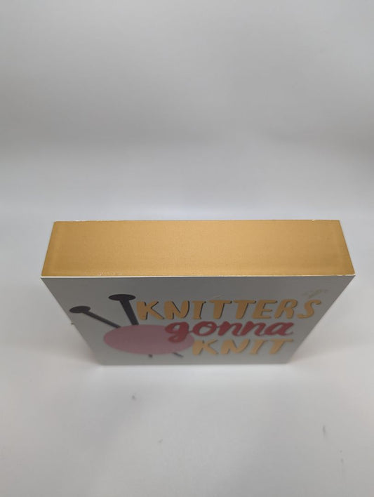 "Knitters Gonna Knit" Gold and White Knitting Wall Decor