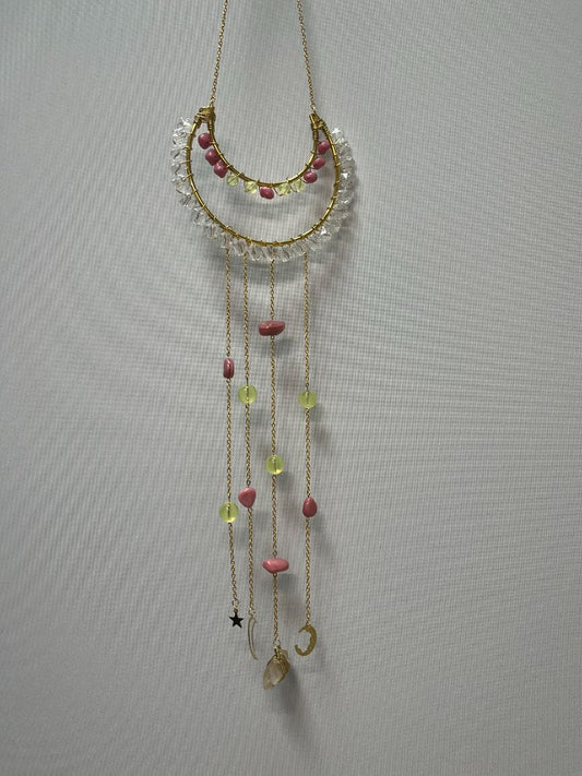 Celestial + Clear Quartz Gold, Pink, & Green Beaded SunCatcher Hanging Wall Decor | Handmade