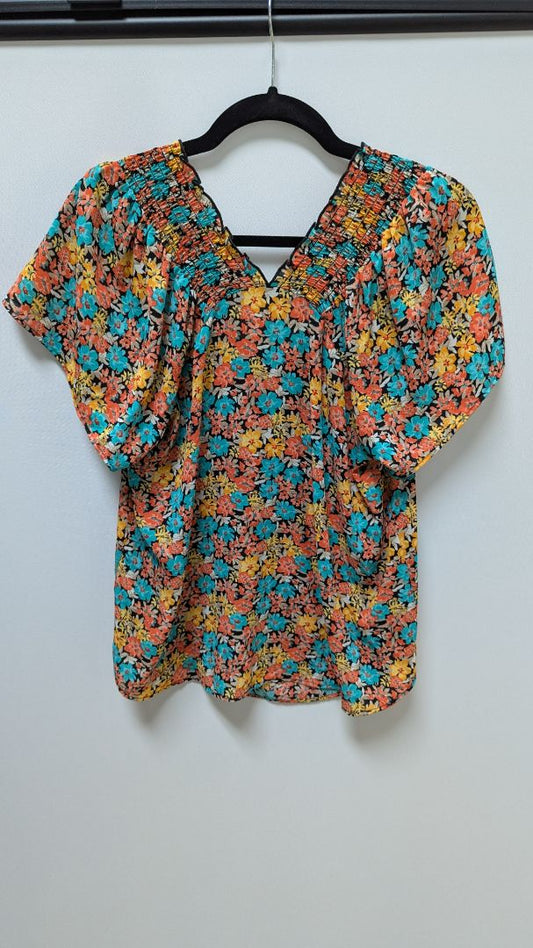 PLEIONE Multicolor Floral Ruched-Shoulder Blouse