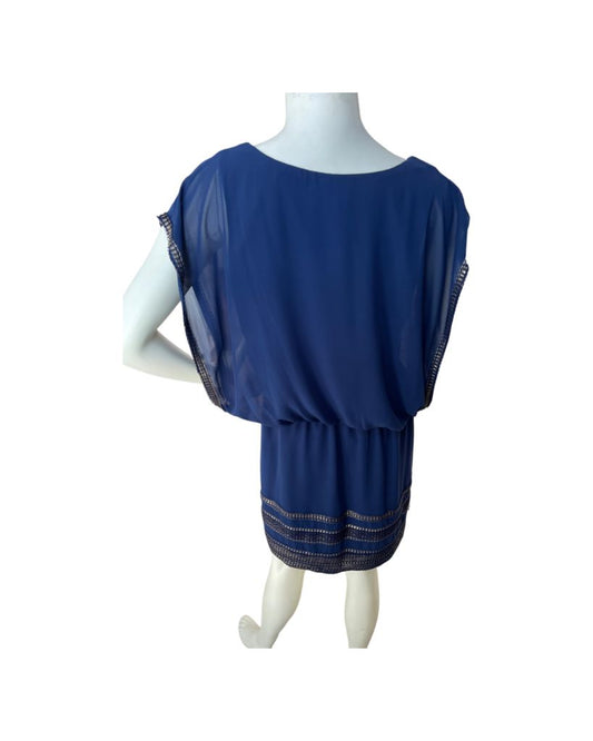 SLNY Navy Sleeveless Drop Waist Midi Dress with Gold Accents
