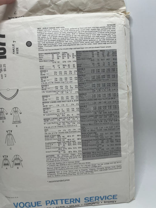 Vintage Vogue Patterns 1877 Size 7 Girls' Dresses and Veil 19 Pieces Sewing Pattern