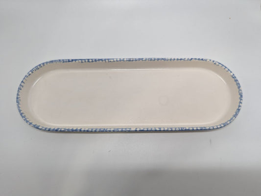 White and Light Blue Lined Long Rounded Ceramic Dish Decor
