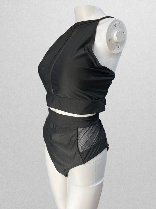 Black High-Cut Halter Neck Mesh Swim 2 Piece Set
