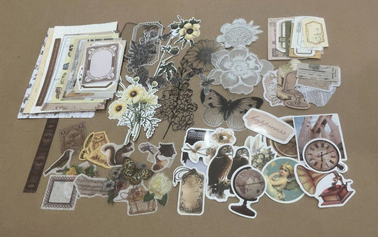 White/Tan Cottagecore Vintage Junk Journal Kit – 81 Pcs Ephemera, Stickers & Textured Paper