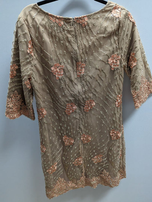 Belle Badgley Mischka Brown Embellished Dress with Gold and Peach