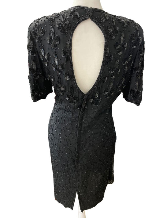 Vintage Black Silk Sequin Open Back Short Sleeve Cocktail Dress