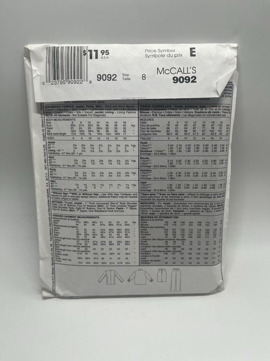 McCall's 9092 Lined Jacket, Shirt, Pants & Skirt Sewing Pattern Size 8