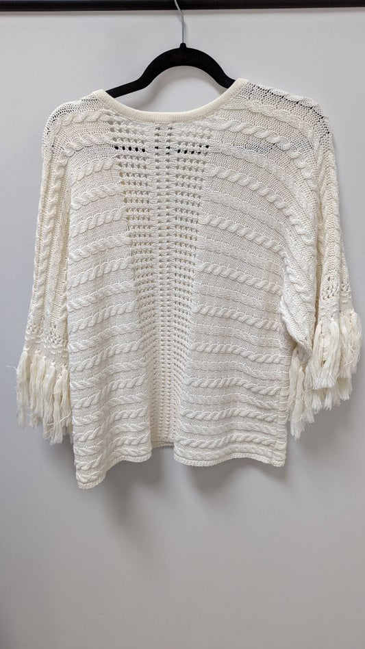 Cabi Ivory White V-Neck Crochet Fringe Sweater