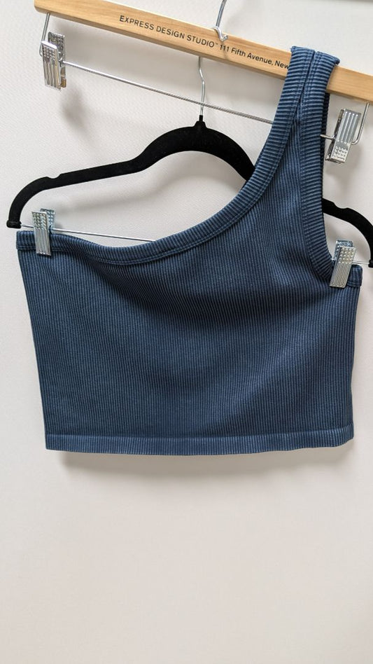 savvi Dark Blue Ribbed Knit One-Shoulder Crop Top
