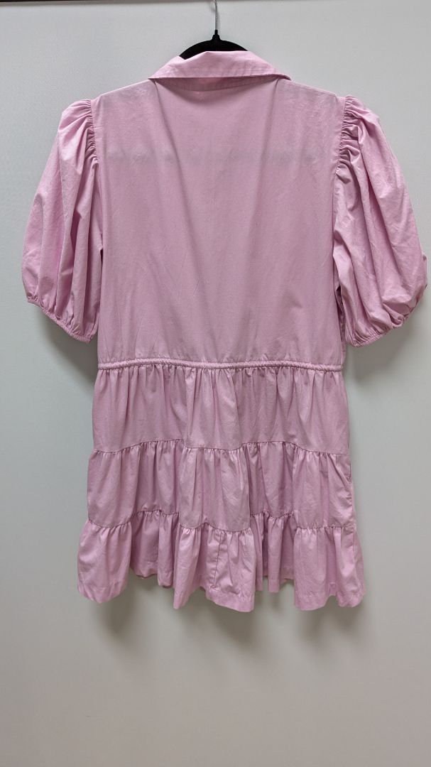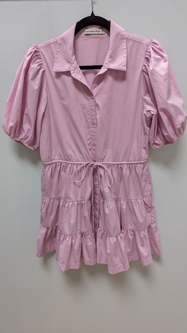 Abercrombie & Fitch Pink Button-Down Peasant Dress. Size Small/Petite. Gently used, with some minor spotting. It features short puff sleeves with elastic cuffs, tiered ruffles, a button-down front closure, a drawstring waistband, and 2 pockets.