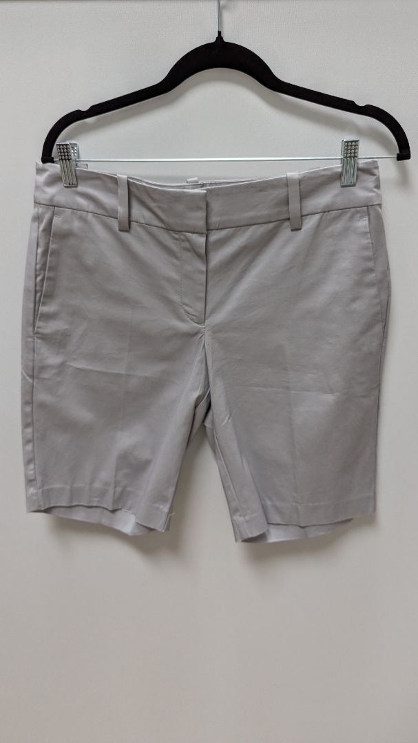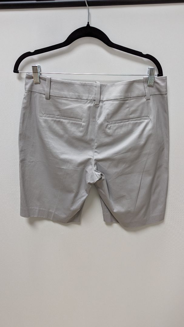 Ann Taylor Grey 10" Bermuda Shorts. Size 6. New with tags. It features a zipper and hook closure, with 2 front pockets, 2 back pockets, and belt loops.