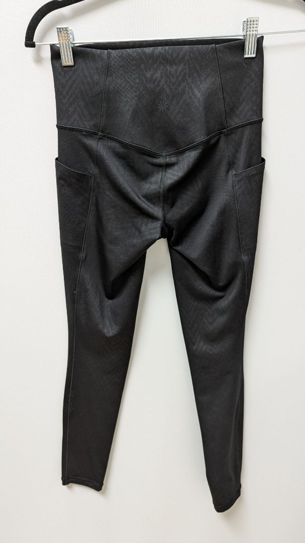 ATHLETA Black Animal Print Salutation Stash Pocket II 7/8 Tight Leggings. Size XS. Gently used; minor inherent defects may be present. It has an elastic waistband, 2 side pockets, and a cropped length.