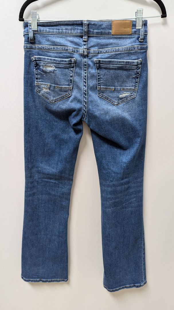 BKE Medium Wash Payton "Universal Fit" Mid-Rise Distressed Bootcut Jeans. Size 24x31.5 (see measurements). Gently used, with some minor stretching and fraying. It has a zipper and button front closure, 5 pockets, and distressing.