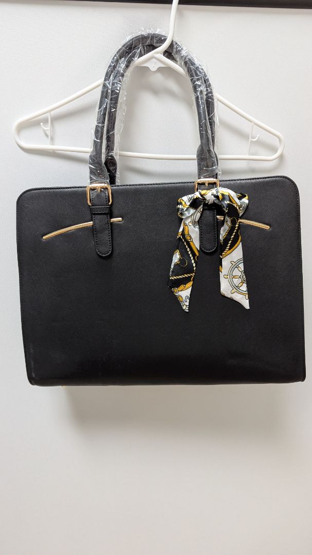 Black Faux-Leather Travel Purse with Scarf. New without tags. It has a scarf accessory on the front, 2 handles, gold-colored metal detailing, 2 side loops for a crossbody strap (included), and it includes a velcro sunglasses holder. It has a zippered inside pocket with a key lock (keys included). There are several other inside pockets along with a faux-suede laptop sleeve.