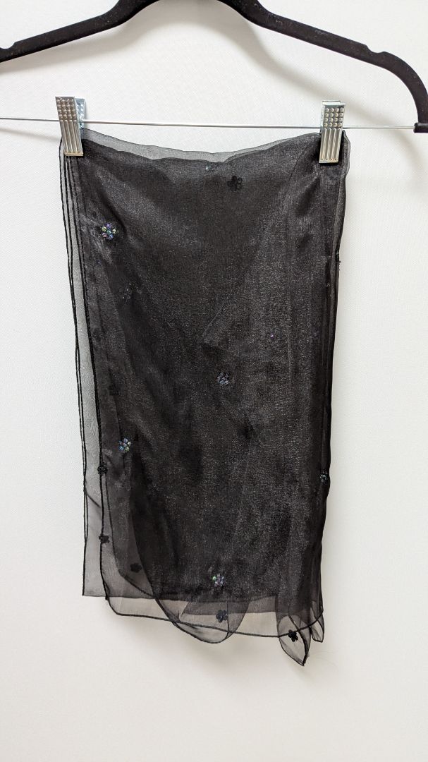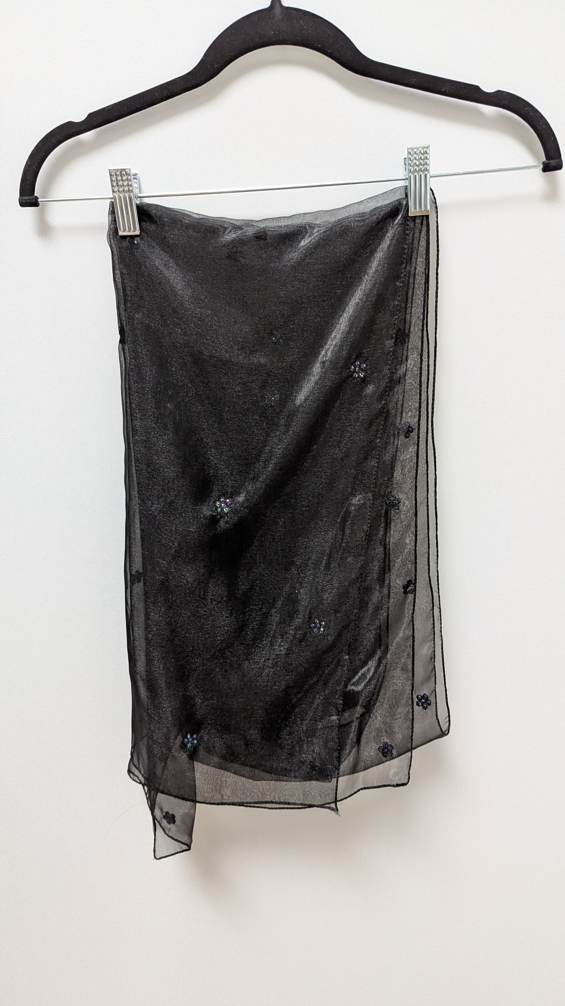 Black Sheer Scarf with Sequin Flowers. Very gently used, with very minor fraying and possible snags.