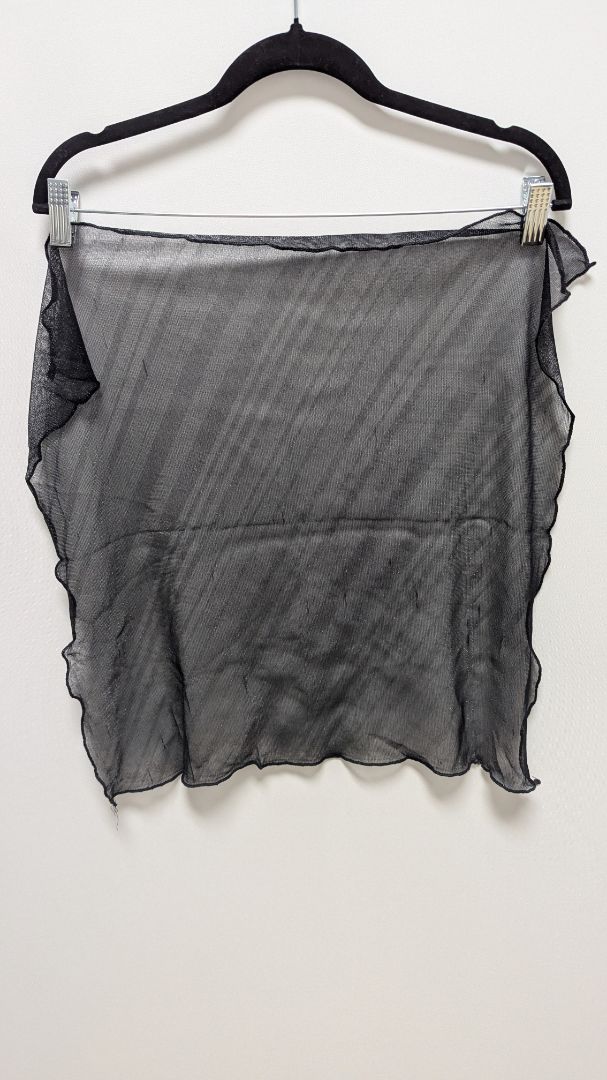 Black Sheer Shimmer Square Scarf. Gently used, with some minor snags/fraying, overall great condition. It is slightly sheer with a seamed edge.