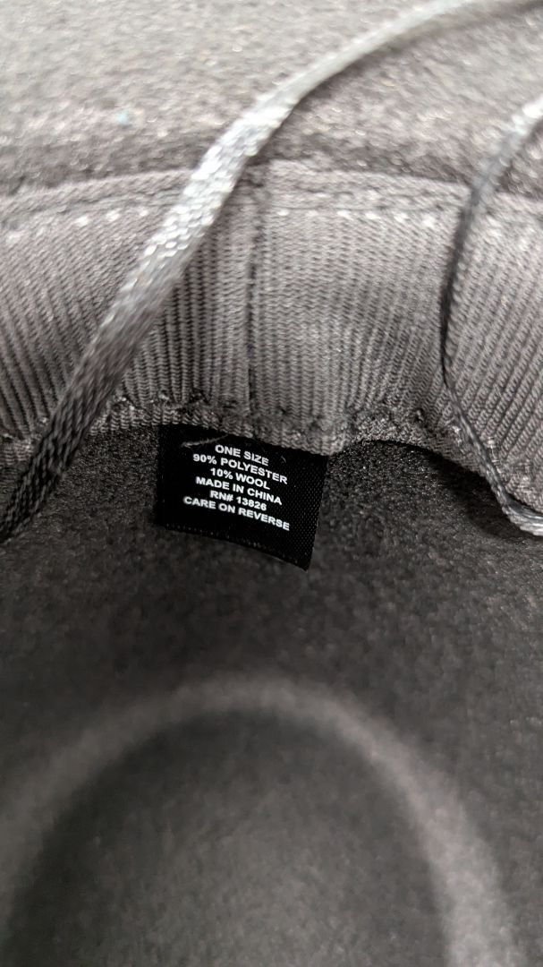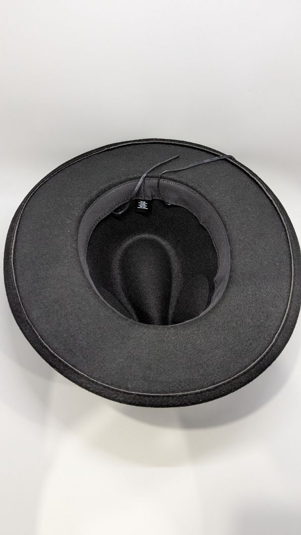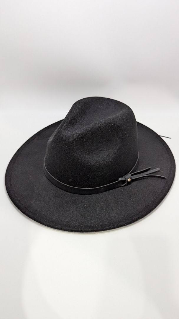 Black Wool Faux-Leather Cord Fedora Hat. Very gently used, with minor markings.