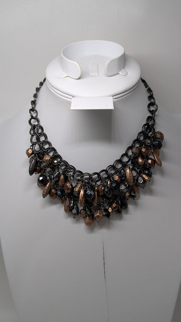 Black/Bronze 2-Strand Chain Necklace with Beads. Very gently used. It features an adjustable chain length with a lobster clasp, and it has 2 layers of chain with dangling beads.