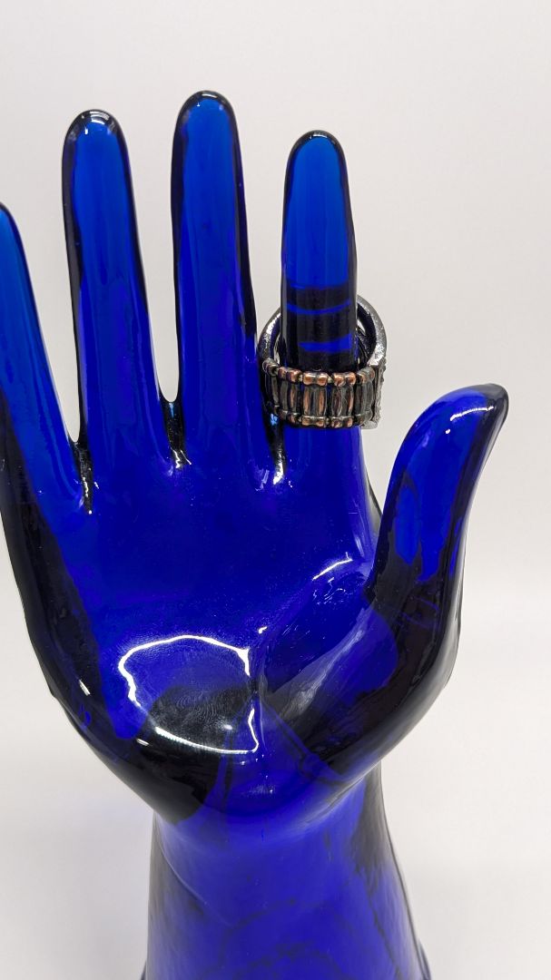 Black/Silver Gemstone Elastic Band Ring. Well worn, but in good condition. Has some missing gems, and tarnishing. Fits ring size 6, but has an elastic band and may fit other sizes.
