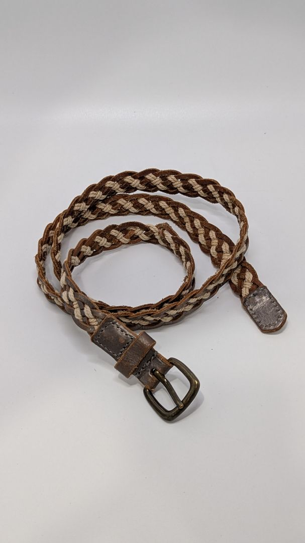 Brown/Tan Braided Faux-Leather Cord Belt. Very gently used, with some fraying/tarnishing, and one ripped area, but in good condition. It features a bronzed metal buckle and the size is adjustable.