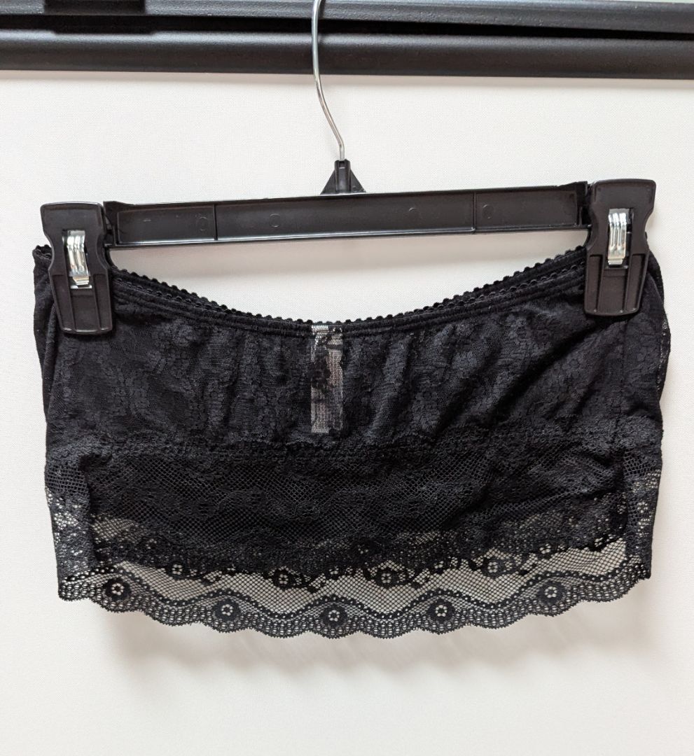 b.tempt'd Black Lace Bandeau Bralette. Size XL. Very gently used, almost-new condition, with possible minor snags. It is made of sheer lace with mesh-lined cups.
