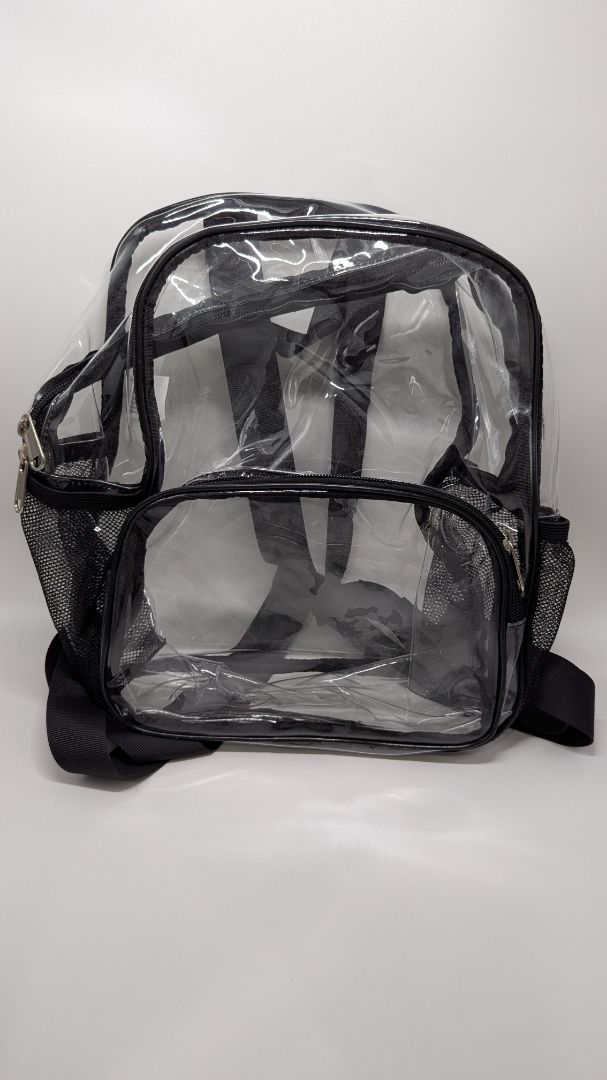 BUSIUW Black/Clear Plastic Backpack. New without tags. It has 2 side mesh pockets, 1 zippered front pocket, a handle strap on the top, and adjustable back straps.