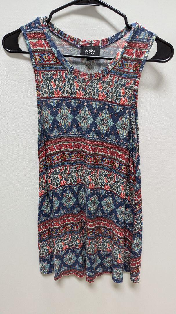 by & by Navy/Red Patterned Knit Tunic Tank. Size Small. Well worn, but in good condition, with wear to the material. It is sleeveless and a tunic length.
