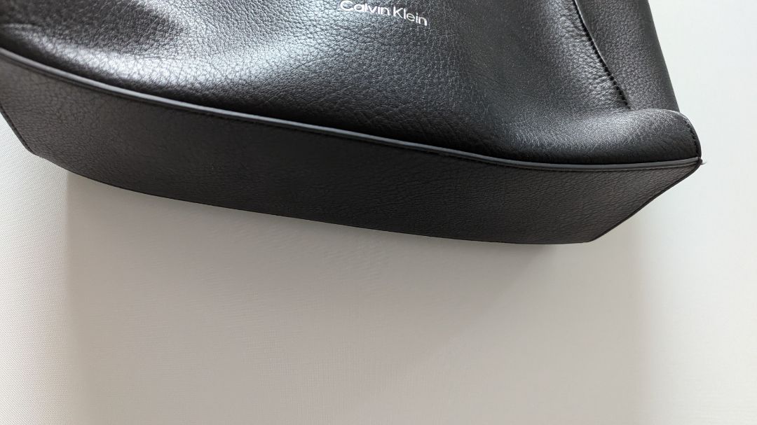 Calvin Klein Black Faux-Leather Tote Bag. Gently used, with some minor scuffing to the exterior and minor discoloration to the interior. It has silver metal detailing, 2 handles, a crossbody strap, 2 inside phone pockets, 1 zippered inside pocket, and a snap-button top closure.