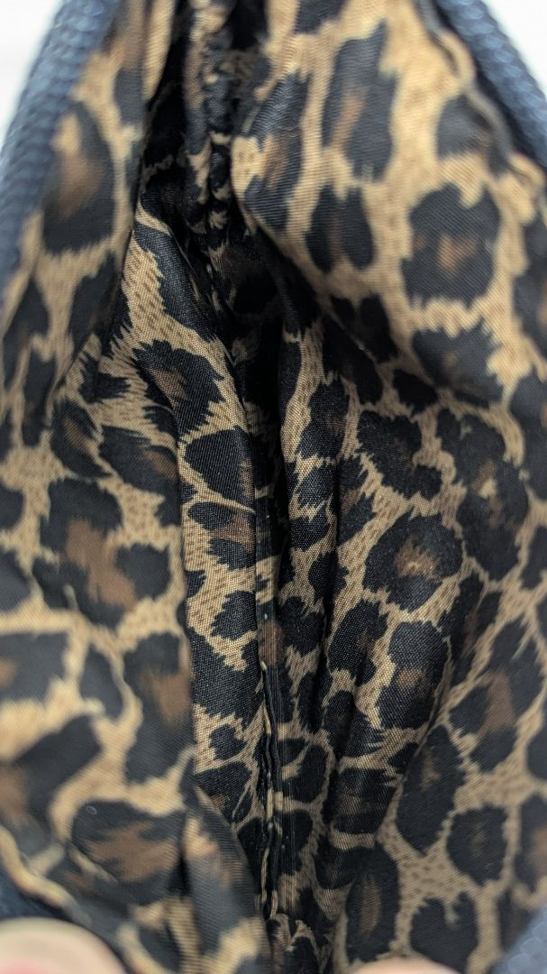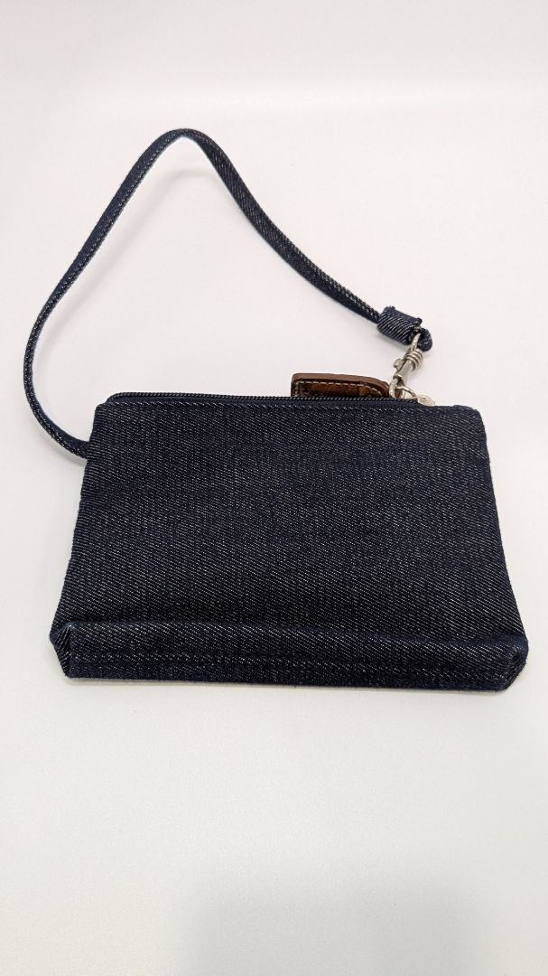 Chapter Club Dark Wash Denim Zippered Pouch. Gently used, with very minor signs of prior use. There is a brown animal print to the interior, a wrist strap, a zippered closure, and the zipper is functional