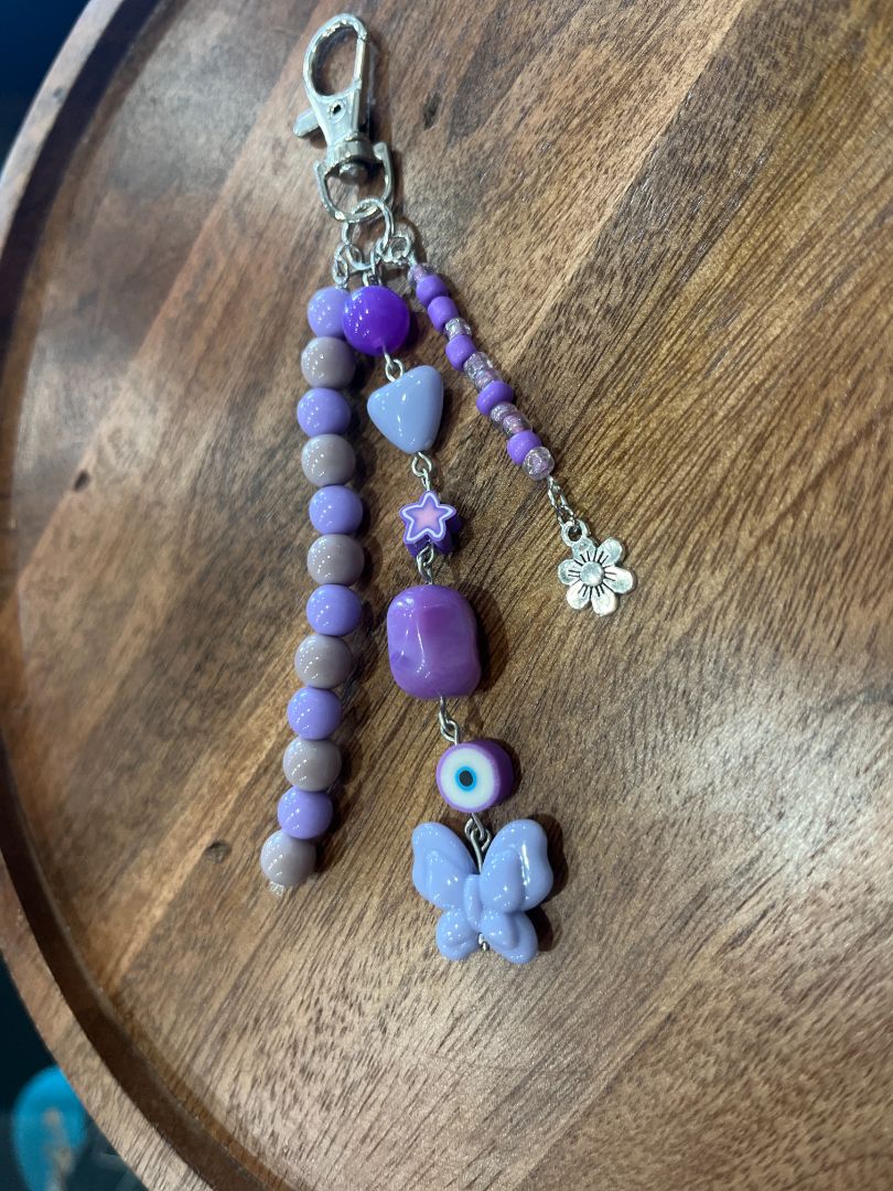 Chunky Purple Beaded Bag Charm/Keychain w/ Butterfly & Flower