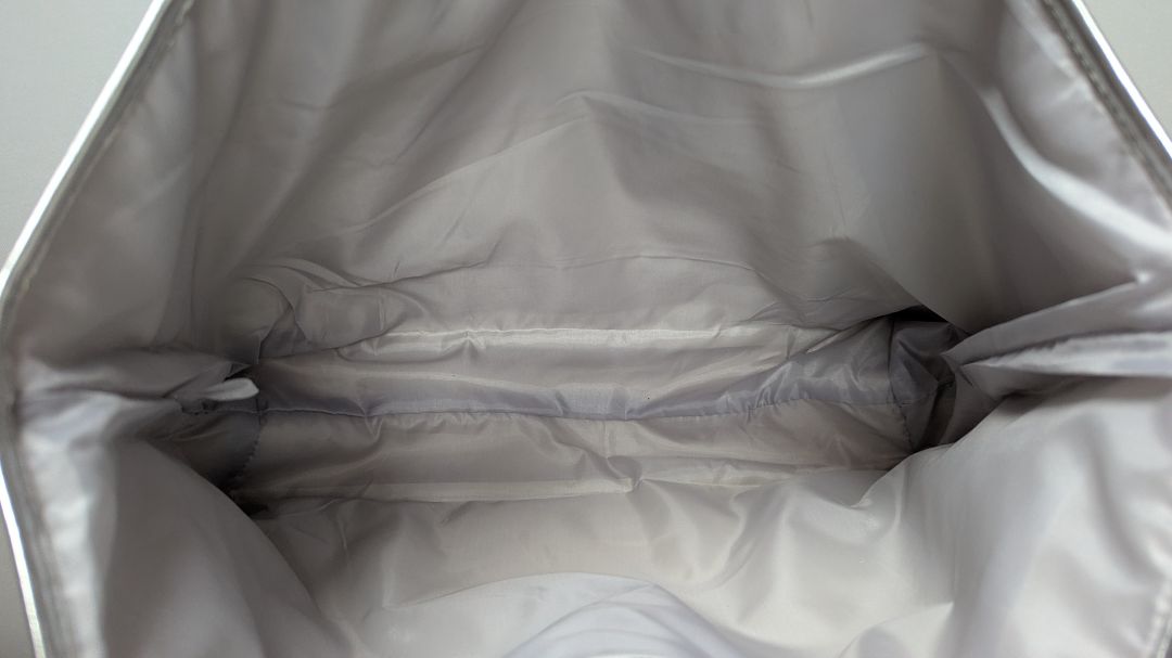 Clinique Silver Metallic PVC Woven-Style Tote Bag. Very gently used, with minor signs of prior use. It features 1 main pocket, 2 handles, and a faux-woven-style texture.