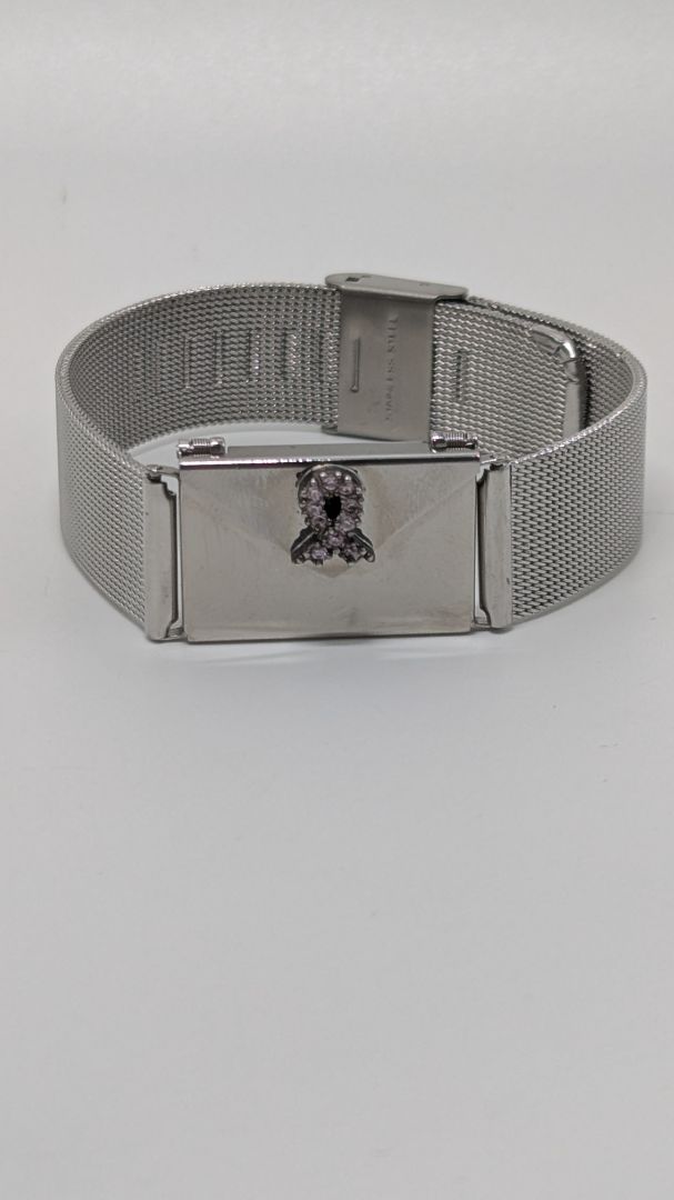 Connextion Silver Breast Cancer Ribbon Stainless Steel Bracelet. Gently used, with some minor tarnishing/scratches.