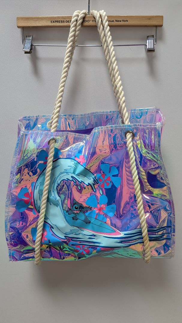 Disney Lilo & Stitch Iridescent Beach Tote Bag. Very gently used, with minor markings to the exterior from storage. There is also minor wear to the rope material/straps.
