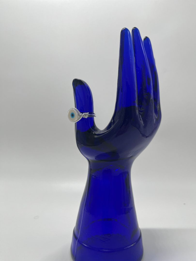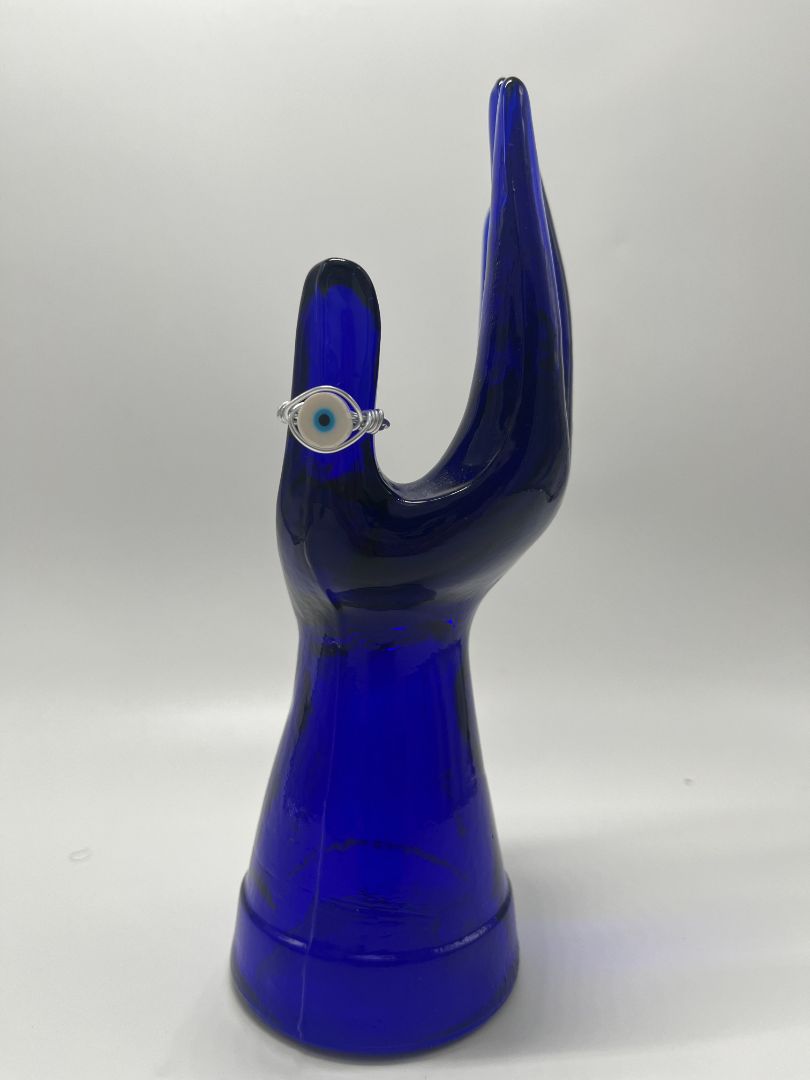 Handcrafted from 17mm silver wire and a clay, white evil eye protection bead. Size 7.
