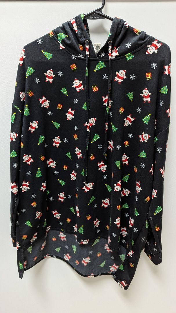 eye candy Black Santa Holiday Graphic Hoodie. Size 1X. Very gently used; almost-new condition, while minor inherent defects may be present. It has a drawstring hood, long sleeves, and Santa/Christmas/holiday graphics.
