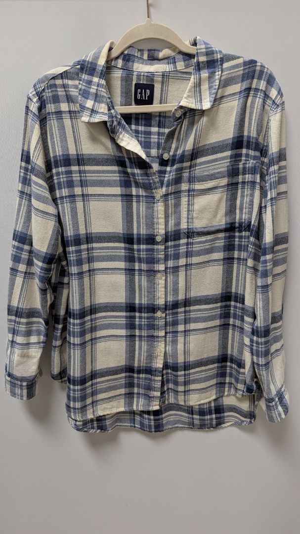GAP Blue Plaid Button-Down Flannel Shirt. Size XL. Gently used, with some minor wear to the material. It has long sleeves, a collar, and 1 left side chest pocket.