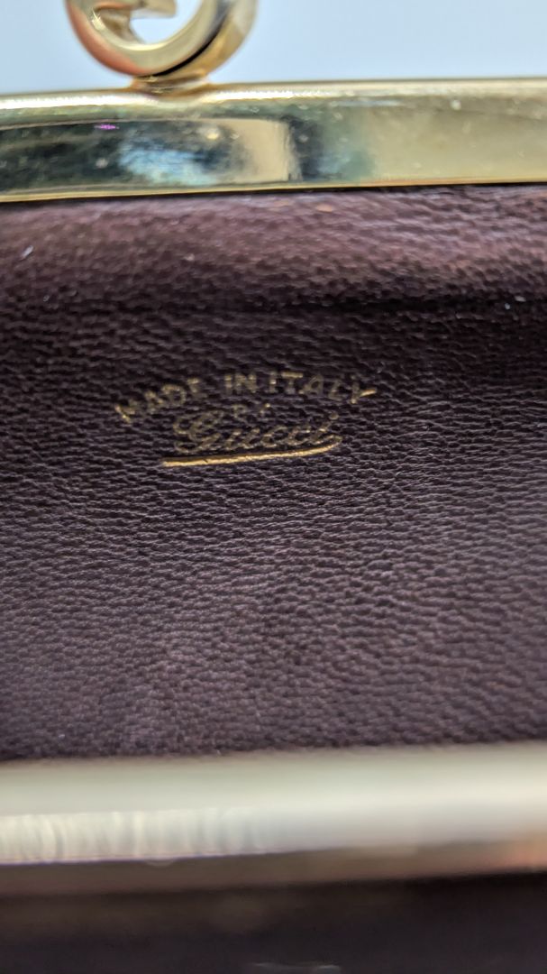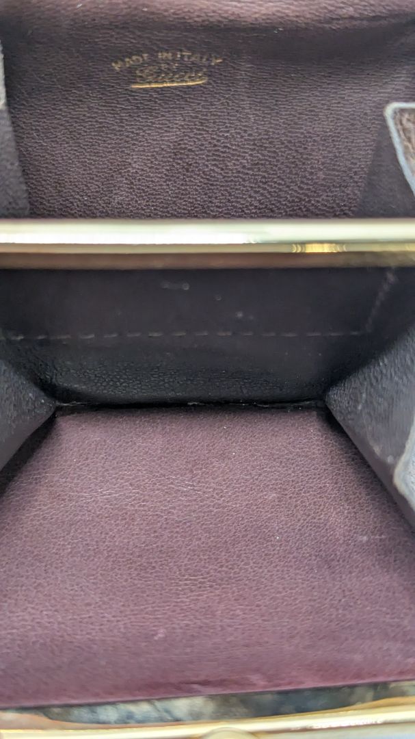 Gucci Brown Leather GG Kiss Lock Coin Pouch. Gently used; in excellent vintage condition. It has minor signs of use/wear. There is a "GG" top metal clasp and 3 interior pockets.