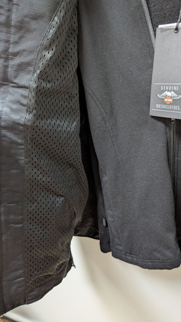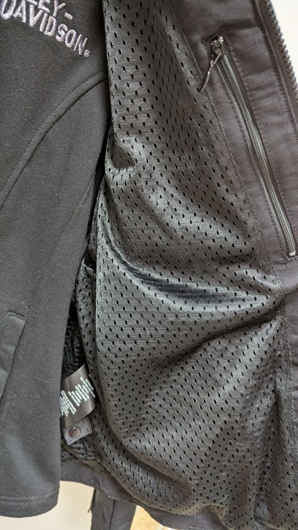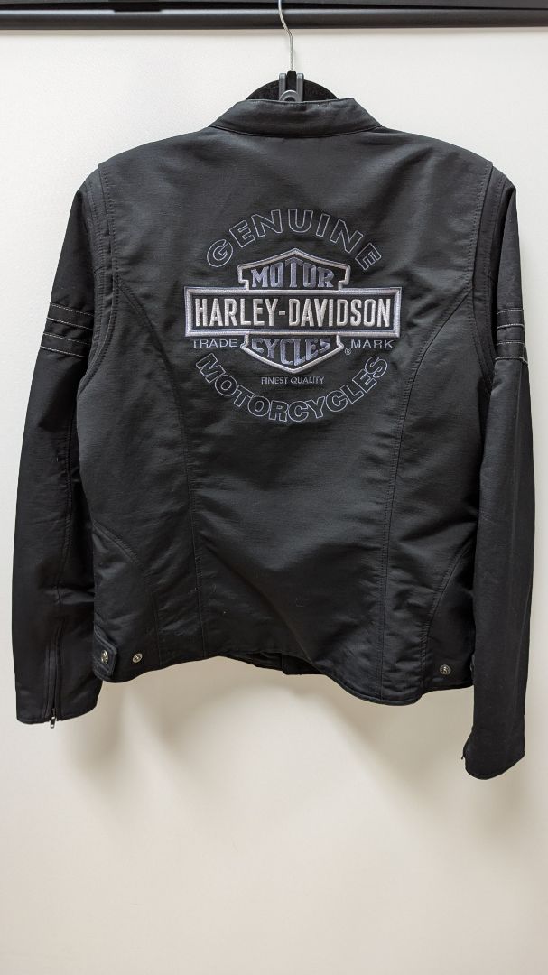 Harley Davidson Women's Black 2PC Vest-Jacket Combination Set. New with tags. It includes 2 pieces: the inner lining vest and the outer jacket. The items connect with buttons at the hems and shoulders. The items can also be worn separately. The vest liner has a zippered front, a hood, and 2 front pockets. The jacket has a zippered front with a button at the neck, 2 zippered pockets, and zippered sleeve cuffs.