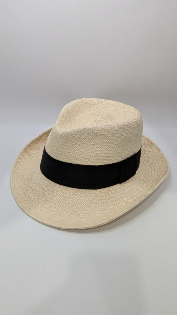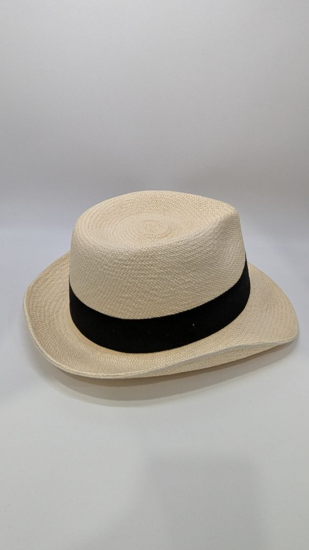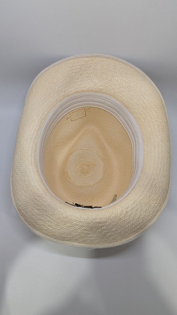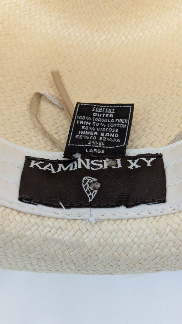 Kaminsky XY Light Tan Toquilla Fiber Fedora Hat. Size Large. Very gently used, with some punch holes to the brand tag, and very minor signs of prior wear.