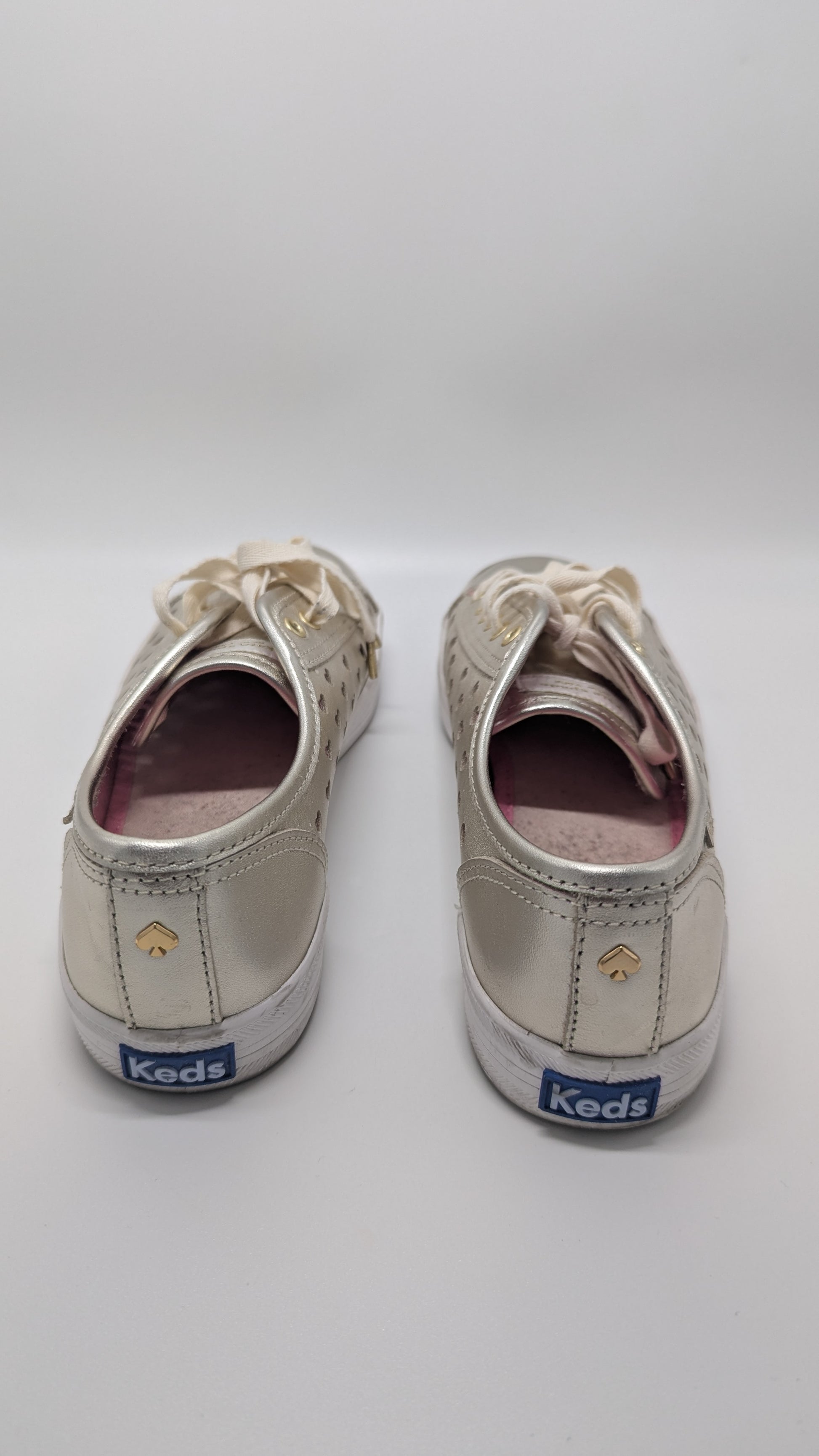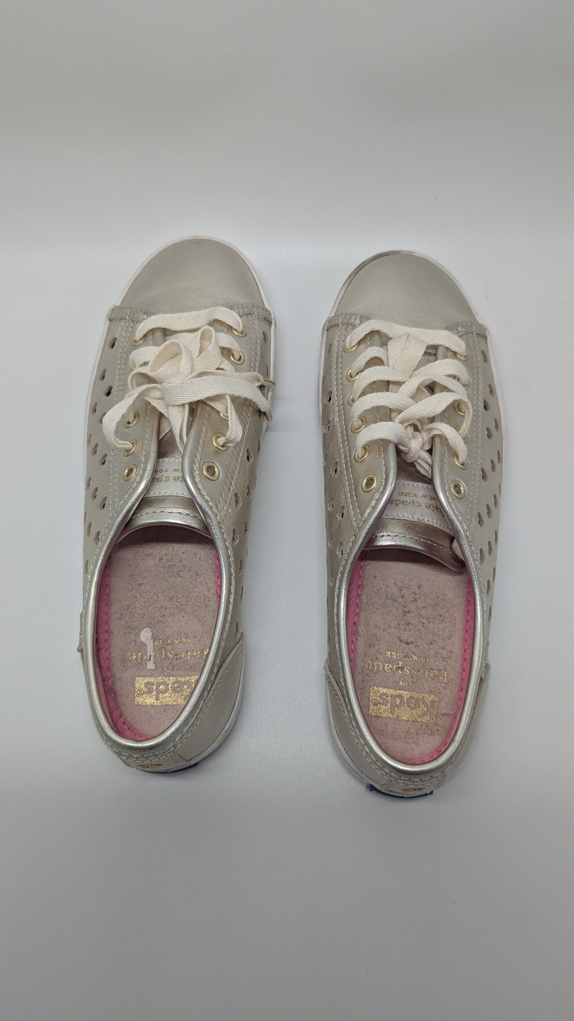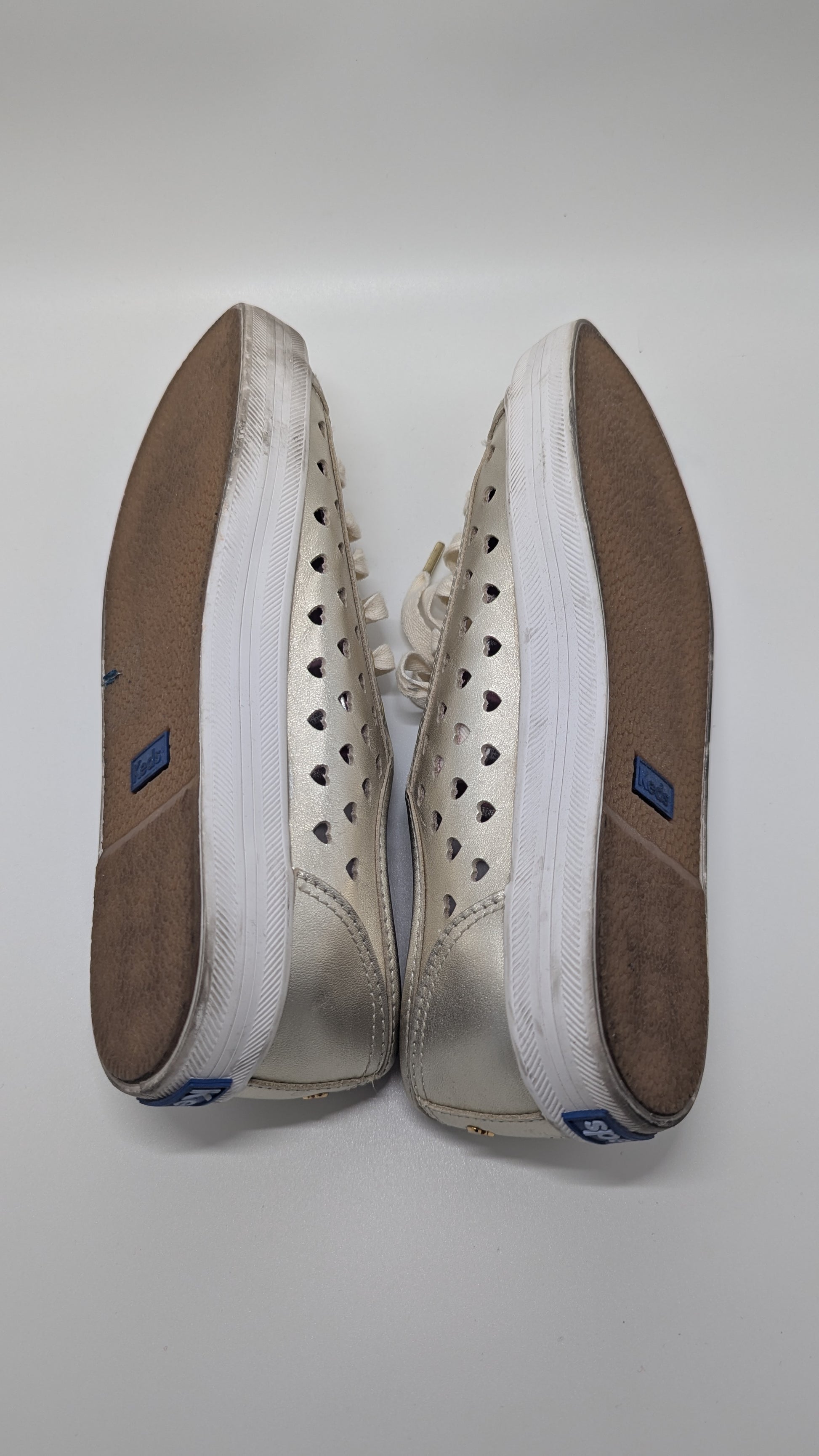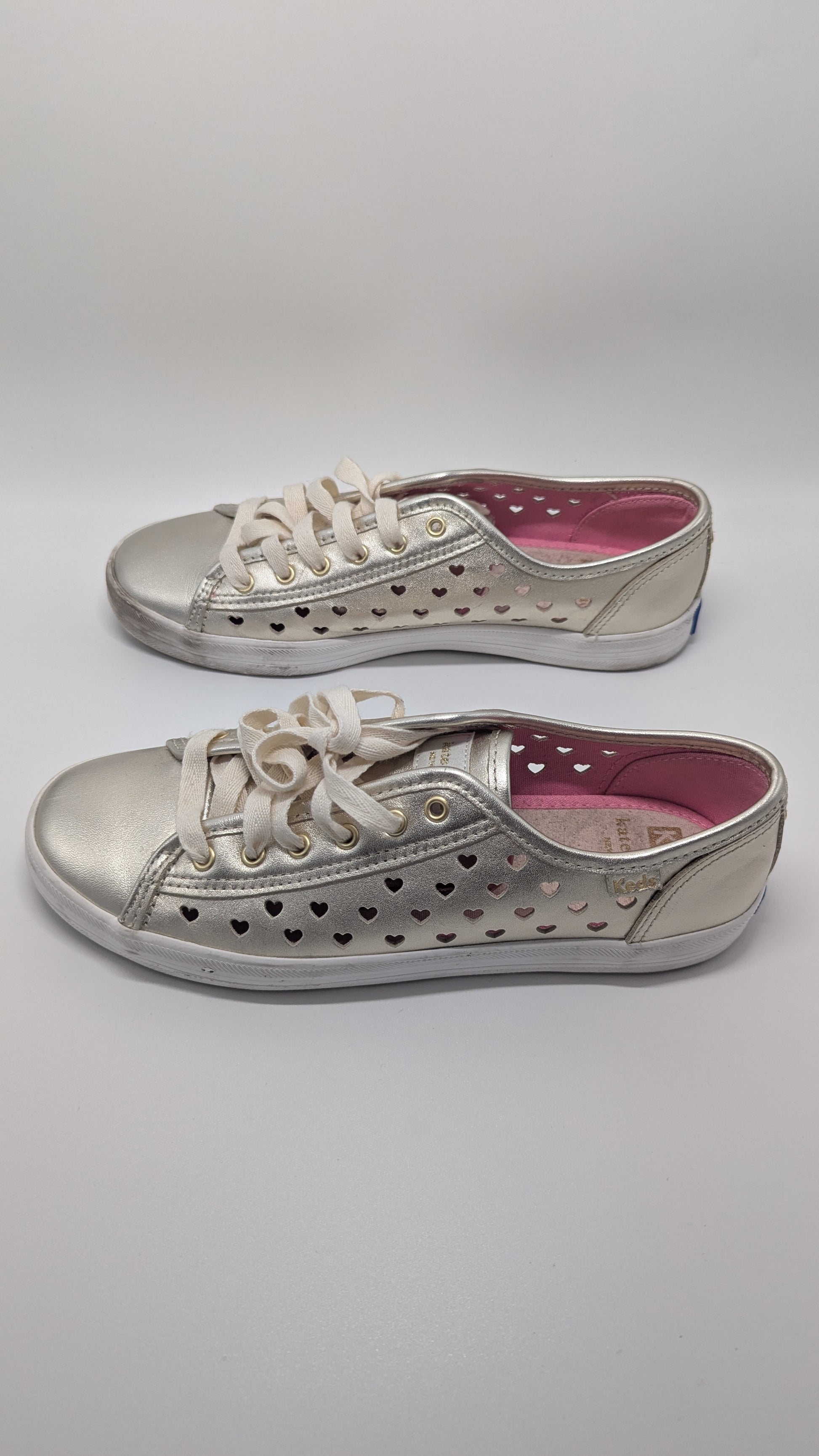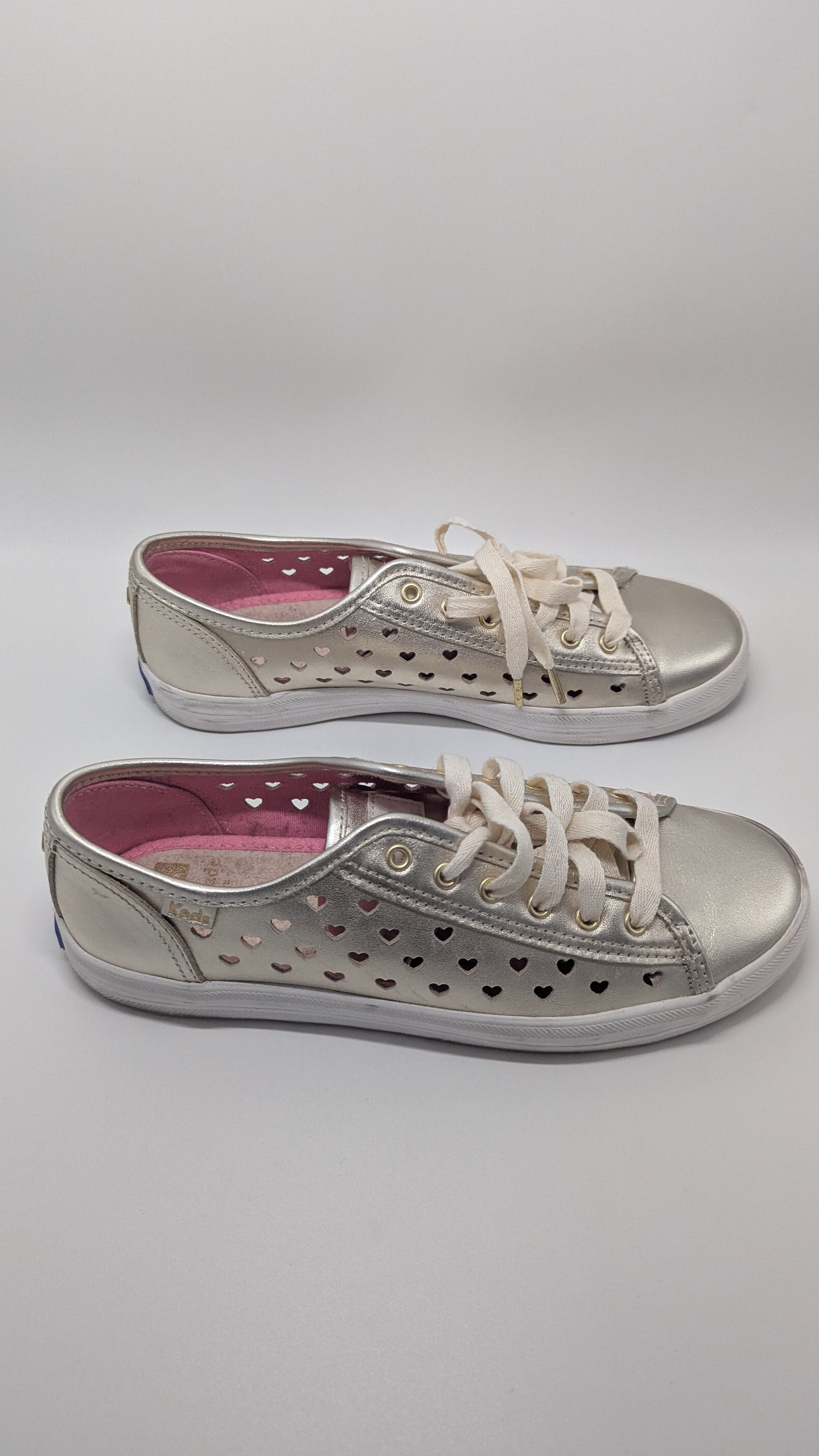 Keds x Kate Spade Silver Heart Kickstart Sneakers. Size 6.5. Well worn, with wear to the inner and outer soles, but in good condition. It features a silver metallic sheen with heart cutouts and a lace-up style.