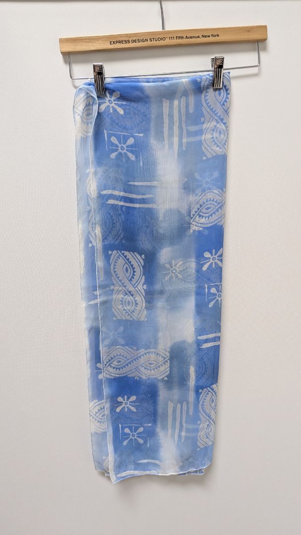 Light Blue/White Printed Sheer Scarf. Gently used, with some very minor snags/pulled seams. It features a mixed motif pattern, and it is sheer.