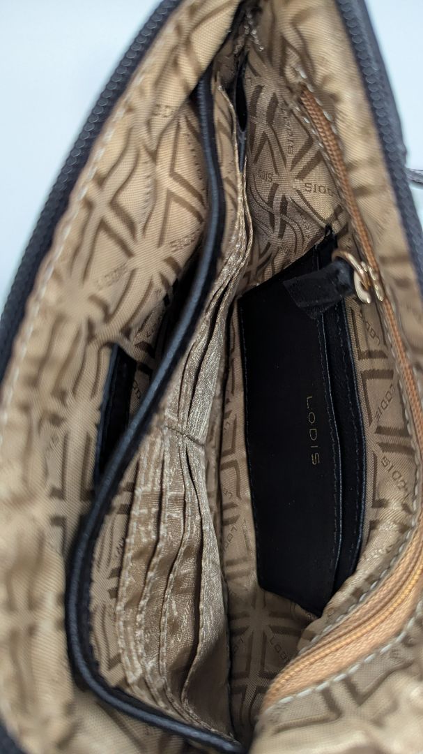 Lodis Black/Gold Zippered Pouch with Wrist Strap. Very gently used, with some minor scratches. It features gold-colored metal detailing, 1 front zippered pocket, 1 back pocket, 1 inner zippered pocket, 2 main inside pockets, and 10 card slots.