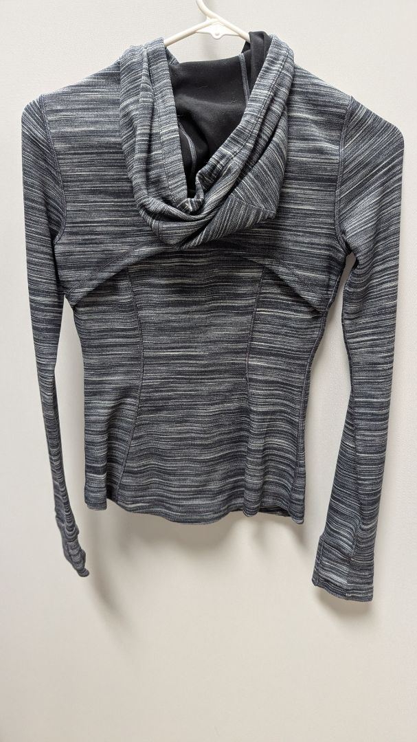 Lululemon Grey Striped Hooded Active Jacket. Size 4. Very gently used, with some minor manufacturer defects at the end of the hood drawstring ties. It has 2 front zippered pockets, thumb-hole sleeve cuffs, and a vented back.