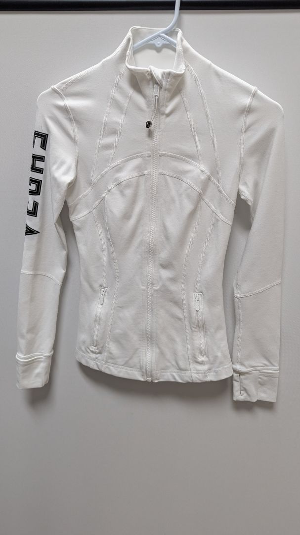 Lululemon White "Vegas Golden Knights" Edition Active Jacket. Size 2. Very gently used, with some minor wear to the material. It has a zippered front, 2 front zippered pockets, a vented back, thumb-hole sleeve cuffs, "Vegas" written on the right sleeve, and the VGK logo on the left sleeve cuff.