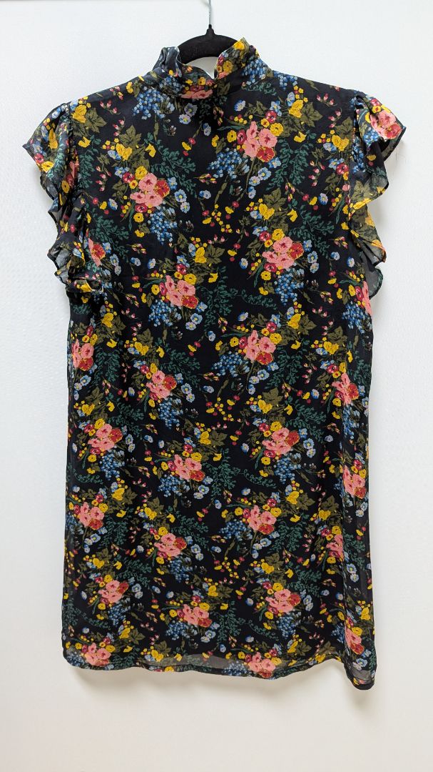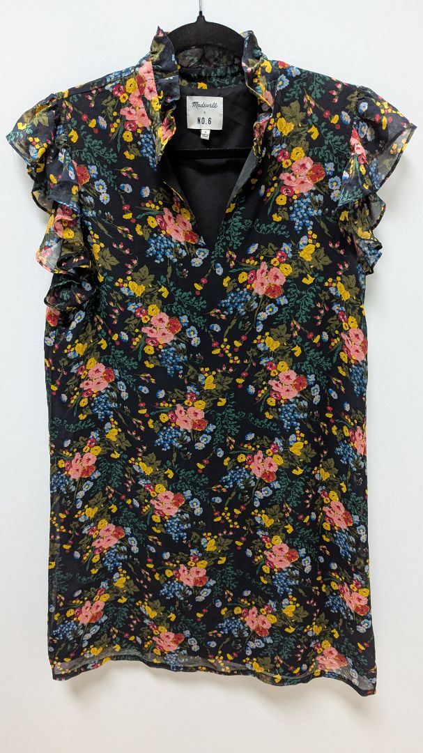 Madewell x NO.6 Black Floral Silk Sleeveless Shift Dress. Size 2. Very gently used. It is sleeveless, with a v-neckline, a ruffled collar, a mini length, and it is lined.