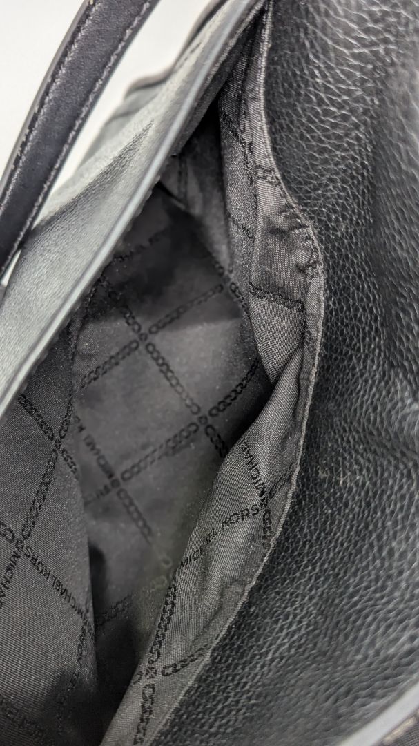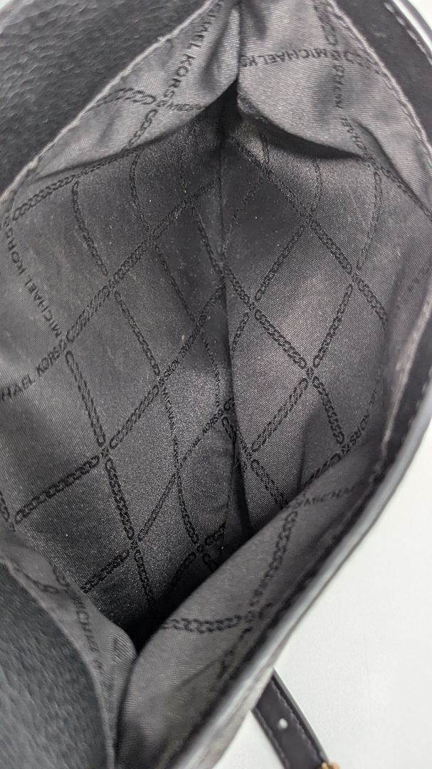 Michael Kors Black Jet Set Charm Crossbody Purse. Well-used, with some spots of wear and discoloration to the interior. It has 1 front pocket, 1 back pocket, 1 inside pocket, a zippered closure, and an adjustable crossbody strap. It also includes the original tags.