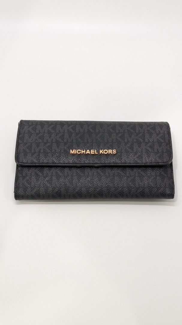 Michael Kors Black Large Trifold Wallet. New with tags. It features a foldover style, with a clear ID slot, 17 card slots, 1 zippered exterior pocket, and 4 larger receipt/cash/misc slots.