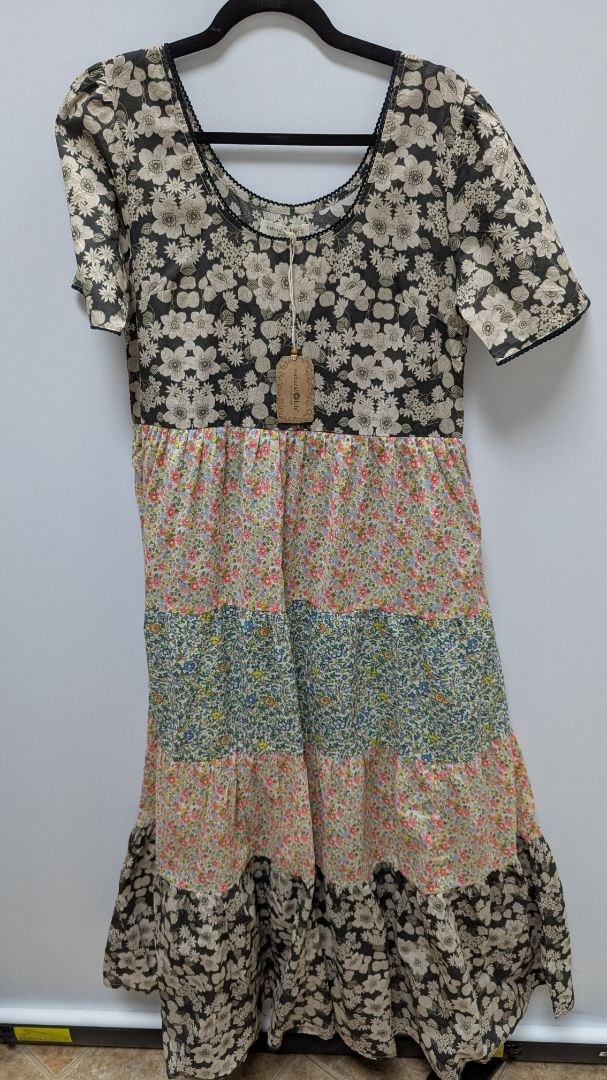 natural life Grey/Multicolor Floral Tiered Maxi Dress. Size Small. New with tags. It features short sleeves, tiered layers, a maxi-length, and a rounded neckline.