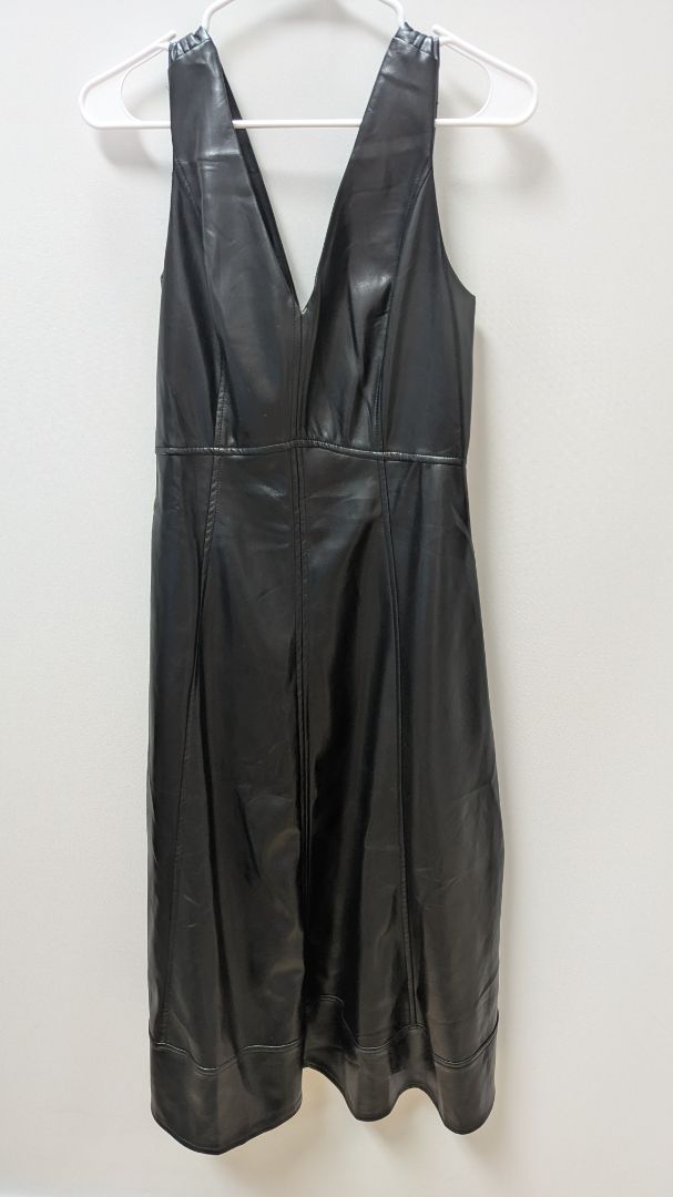 NYLAND Black Belen Faux-Leather Dress. Size Medium. New with tags, with some minor markings from storage. It has a v-neckline, a flared fit, a zippered back with a hook clasp, and 2 pockets.